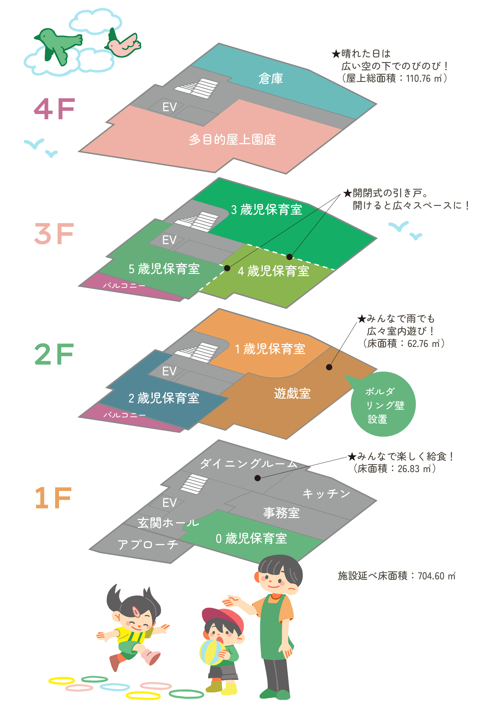 やすらげる空間づくりを目指した建築家のアイディアがたくさんつまっています。もちろん採光にもこだわり、園名に相応しい気持ちの良い空間を実現しています。